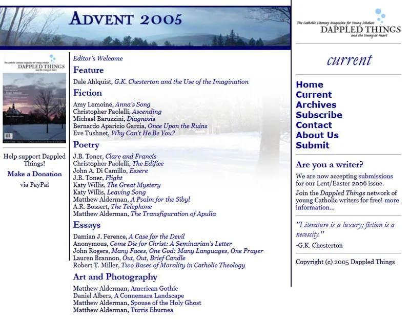 This December marks twenty years since the release of Dappled Things’ first issue, in which we began our quixotic adventure to help bring Catholic art and literature back to life. It was an online-only edition that was admittedly rough around the edges, yet looking back on it, I’m struck by the proportion of names among its contributors that have since left a mark on Catholic culture. Among them are Dale Ahlquist, whose Chesterton Schools Network has revolutionized Catholic education; John DiCamillo, now president of the National Catholic Bioethics Center; Matthew Alderman, whose designs have brought beauty back to sacred architecture; and of course a variety of writers who have made their names across different genres, including Fr. Damian Ference, Eve Tushnet, and one young Katy Willis. Better known to our readers as Katy Carl, our longtime editor-in-chief, she is now an award-winning novelist and a leading figure in today’s Catholic literary renaissance, nurturing writers at the first Catholic MFA program in the country and helping new works come to light as editor of Luminor, Word on Fire’s literary imprint. It was an auspicious beginning that I can only attribute to the will of Providence, especially considering this penniless journal was published by a group of kids who were either still in college or barely out of it.